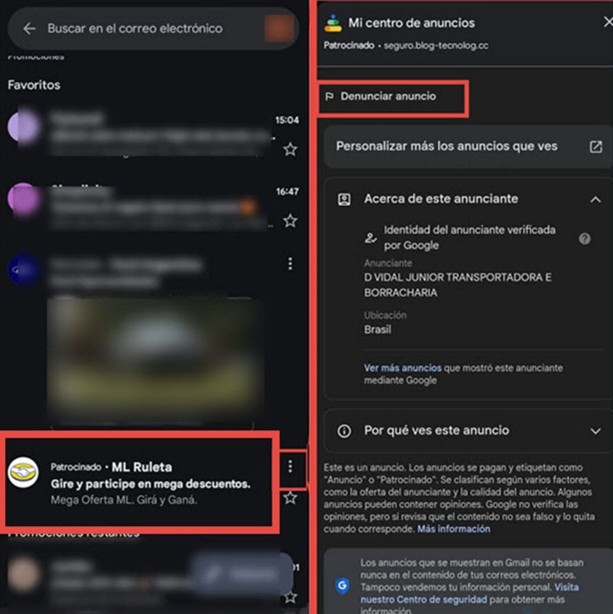 Anuncios patrocinados en Gmail: Los correos llegan a las casillas como correos patrocinados, por lo que logran confundir al usuario que puede suponer que existe un control sobre anunciantes. Imitan marcas reconocidas con ofertas irresistibles con el objetivo de que hagas clic y entregues tus datos personales o bancarios, luego de llevarte a un sitio falso de phishing.