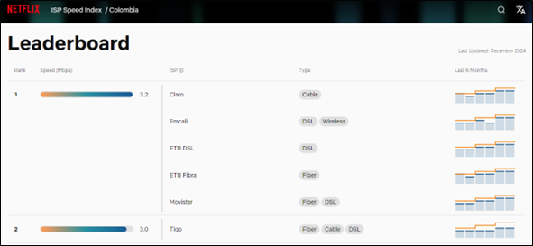 El Índice de Velocidades de ISP de Netflix evalúa el desempeño de esta plataforma durante el período de mayor actividad para un proveedor de servicios de Internet específico. Es importante destacar que este índice no refleja el rendimiento general para otros servicios o datos que puedan transitar por la red específica de dicha empresa.
