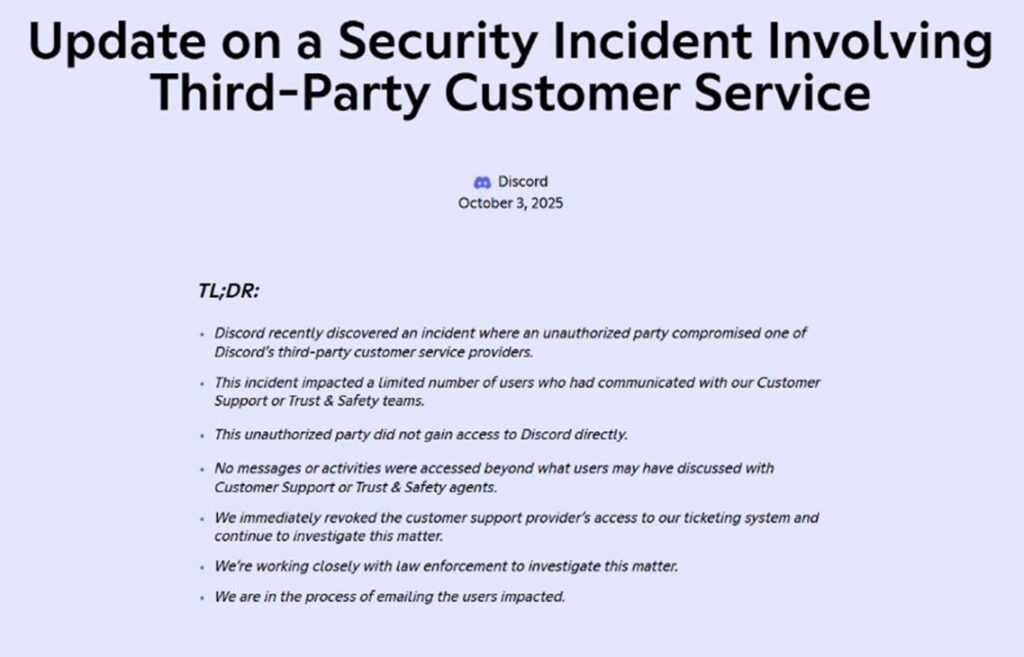 La plataforma de mensajería Discord, que utilizan más de 200 millones de personas cada mes, confirmó el viernes pasado que fue afectada por un incidente de seguridad en su servicio de soporte a usuarios, administrado por un tercero. El proveedor externo sufrió un ataque con fines de extorsión, con características similares a los de tipo ransomware, en el que los atacantes accedieron a datos sensibles y exigieron un rescate para no divulgar la información robada. ESET, compañía líder en detección proactiva de amenazas, analiza el incidente que afectó a usuarios que habían interactuado con los servicios de atención al cliente (customer service) y con miembros de confianza y seguridad (trust and safety).